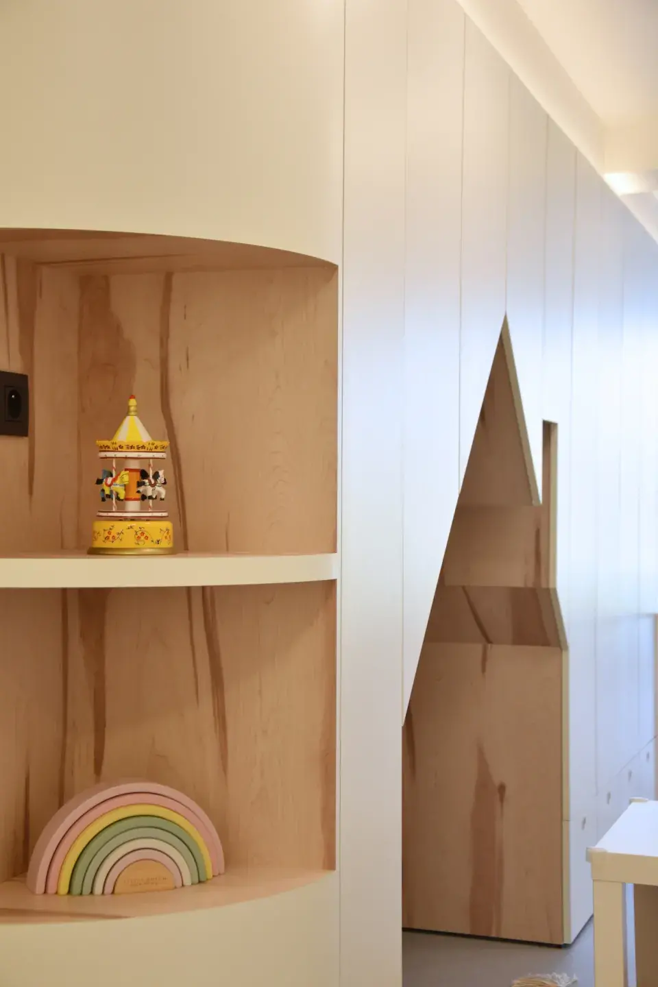 Een casco gelijkvloers werd ingericht als kinderdagverblijf “Kiddo”. De smalle, diepe ruimte werd omgevormd tot een aangename plek voor kinderen en opvoeders, met multifunctionele meubels en ronde koepels voor daglicht. Het maatwerk meubilair voldoet aan de normen van Kind & Gezin en biedt een kindvriendelijke en volwassen uitstraling.
